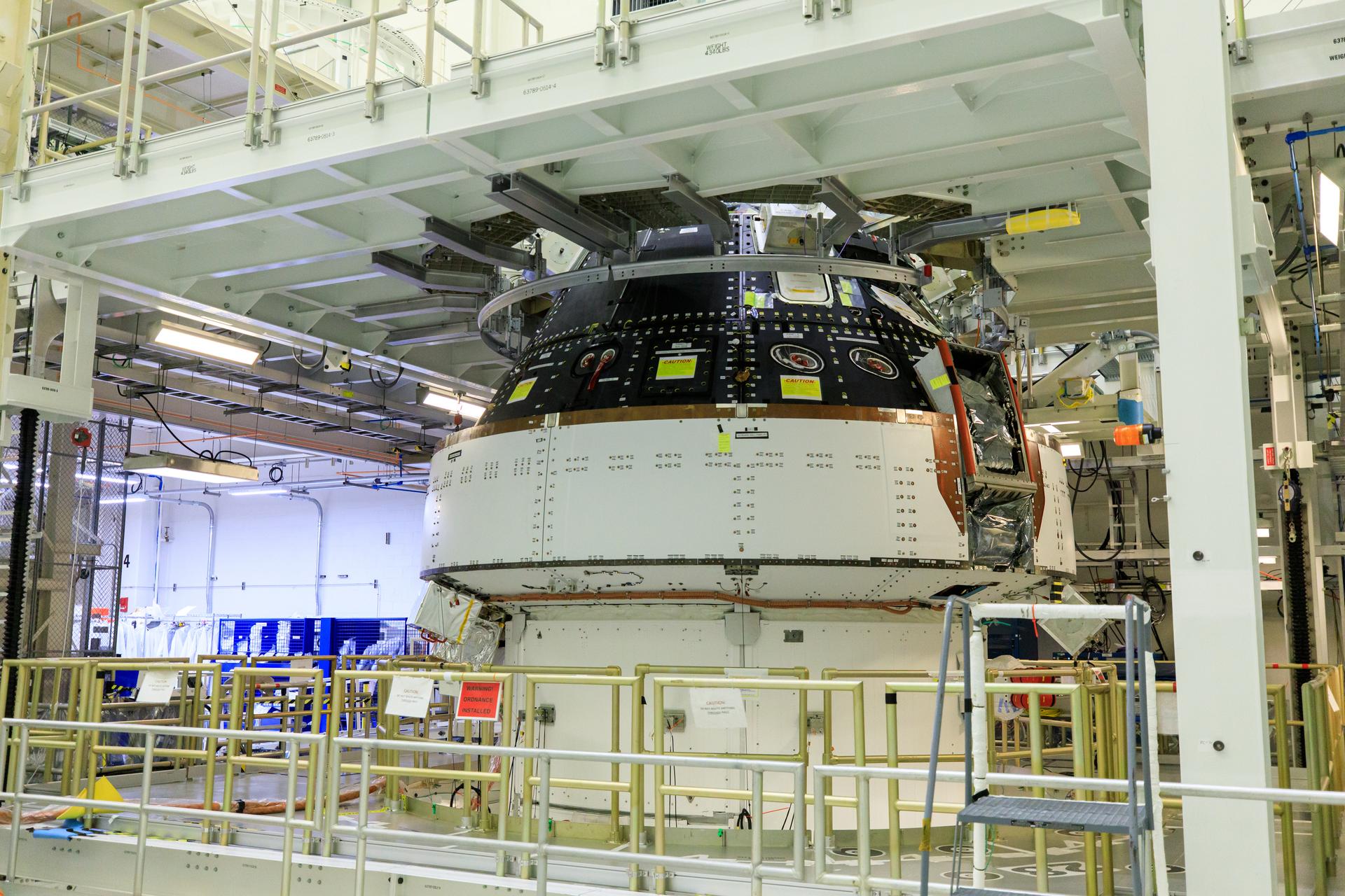 2024年3月15日星期五,美国宇航局阿耳忒弥斯二号任务的猎户座航天器在佛罗里达州美国宇航局肯尼迪航天中心尼尔·阿姆斯特朗操作和检查大楼的最终组装和系统测试室内拍摄。四名宇航员将乘坐阿耳忒弥斯二号的猎户座宇宙飞船绕月飞行,这是美国宇航局通过阿耳忒弥斯运动在月球建立长期科学和探索存在道路上的第一个载人任务。