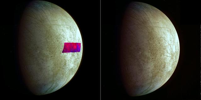 This image, using data from NASA Galileo mission, shows the first detection of clay-like minerals on the surface of Jupiter moon Europa.