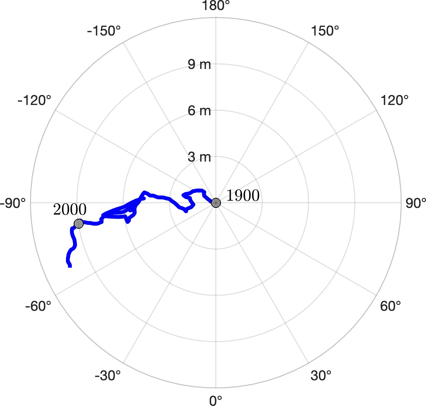 这张图表基于2024年7月NASA资助的一项研究中使用的数据,显示了极地运动,这是一种由几个物理过程共同作用的现象,这些过程广泛地改变了地球上的质量分布,或者在其地幔和地核中产生了导致地球在旋转时摇摆的力。这些变化会导致自旋轴随着时间的推移而弯曲。蓝线从1900年北极附近的自旋轴位置开始,也就是收集第一年的极移数据,并一直跟踪到2023年。旋转轴现在距离1900年时的位置约30英尺(10米),指向加拿大的巴芬湾。2000年前后,地轴突然东移,位于南加州的NASA喷气推进实验室的研究人员在2016年的一项研究中将其归因于格陵兰和南极冰盖更快的融化以及欧亚大陆地下水的枯竭。这项研究的合著者、喷气推进实验室的地球物理学家苏伦德拉·阿迪卡里使用了国际地球自转和参考系服务机构的测量数据来制作这部动画。阿迪卡里及其来自瑞士、加拿大和德国的合作者在2024年7月发表在《自然地球科学》杂志上的一篇论文中发现,1900年至2018年期间极地运动中约90%的反复振荡可以用冰盖和冰川融化以及含水层枯竭导致的地球表面大规模质量重新分配来解释。它还发现,几乎所有长期的、非重复的地轴漂移都是由地幔中的动力学造成的。动画可在https://photojournal.jpl.nasa.gov/catalog/PIA26120上观看