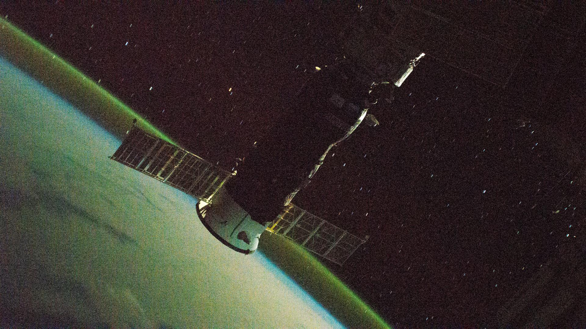 iss 064 e035806(2021年2月21日)--国际空间站与俄罗斯国际空间站进步77号货运飞船合影,照片中连接在Pirs对接舱上,在南太平洋上空270英里处运行。这张长时间照片还显示了地球的气辉(高层大气中微弱的光发射)和星光熠熠的夜空。