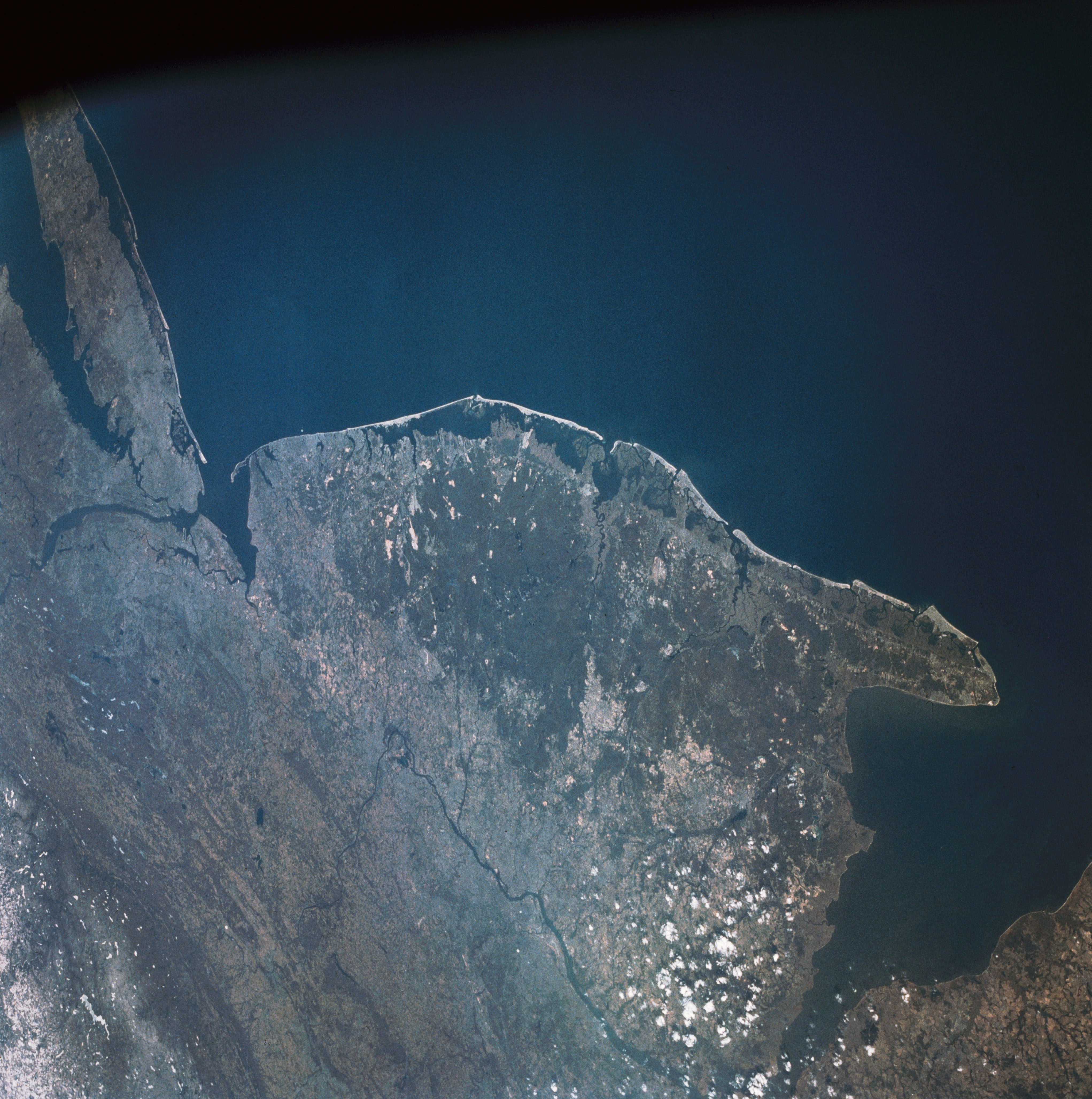 STS 003 -10-606(1982年3月30日)-这张照片中详细展示了整个新泽西州(北纬39.5度,西经74.5度)。特拉华河西岸的宾夕法尼亚州费城和这一自然边界东岸的新泽西州卡姆登以及大西洋城的沿海度假胜地都很容易被看到。再往北,可以看到纽约市和长岛大部分地区的详细信息,而再往内陆,可以看到北部的阿巴拉契亚山脉对角线穿过场景。照片来源:NASA